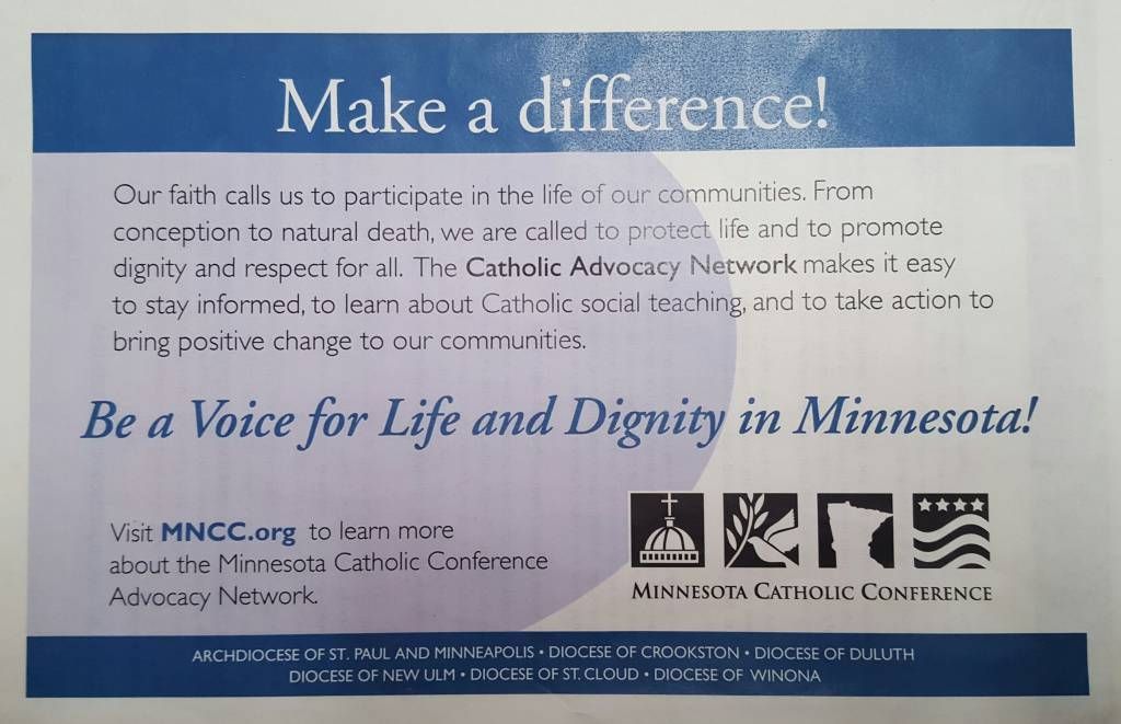 October 16, 2016, is Life and Dignity Sunday in the Diocese of Duluth. It is a day that Bishop Sirba has provided for parishes to discuss our Catholic call to be engaged citizens who are forces of good in our communities. You are invited and have the opportunity to register for the statewide Minnesota Catholic Conference (MCC) Catholic Advocacy Network, which is a faithful, compassionate, moral voice for life, dignity, and justice in our state. If you registered, thank you! We encourage you to take advantage of the many advocacy resources and Catholic Social Teaching tools that the network provides, and we hope that you will be diligent in responding to the occasional e-mails that the network will send asking you to help us “take action” on an important social or public policy issue. Register online at MCC’s website: www.mncatholic.org. MCC is the public policy voice for the sex Minnesota Catholic dioceses.